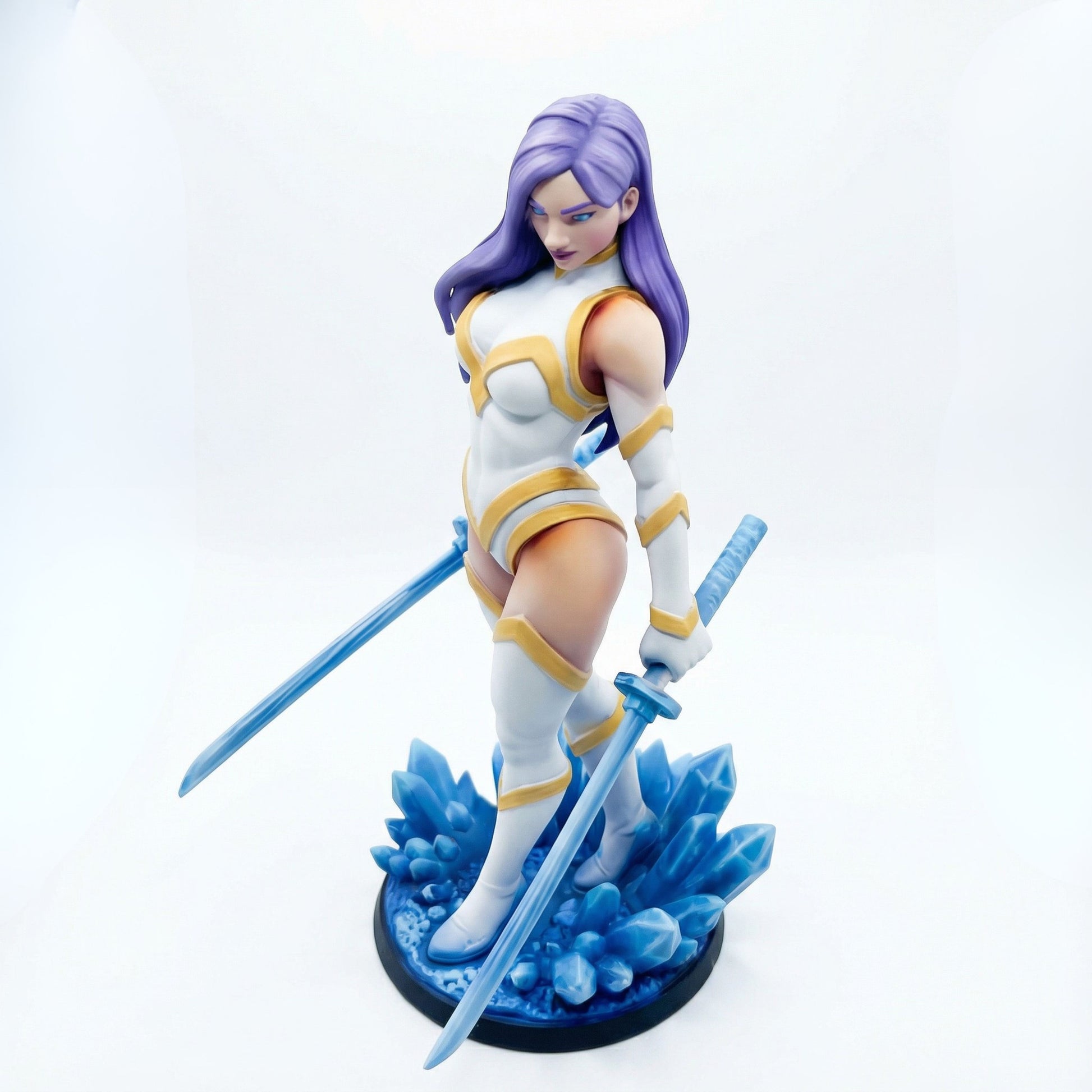 What truly sets the Crystals apart are their extraordinary weapons—forged not from metal, but from the very magical crystals with which they coexist. These weapons are as diverse as they are powerful: living constructs of crystal and energy, shaped into countless forms, designs, and styles. One may take the form of a katana of crystalline light, another an arcane blade etched with runic geometry; there are swords, spears, daggers, axes, polearms, and weapons so abstract they seem closer to spells than steel.